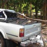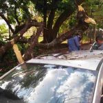 Os galhos amassaram a lataria de um carro modelo Hyundai HB20, um Volkswagen Voyage e uma caminhonente Toyota Hilux.