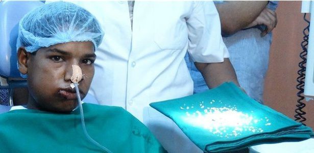 Um garoto indiano foi ao hospital por causa de uma dor na mandíbula direita e foi levado para a sala de cirurgia. Depois de sete horas de operação, os médicos