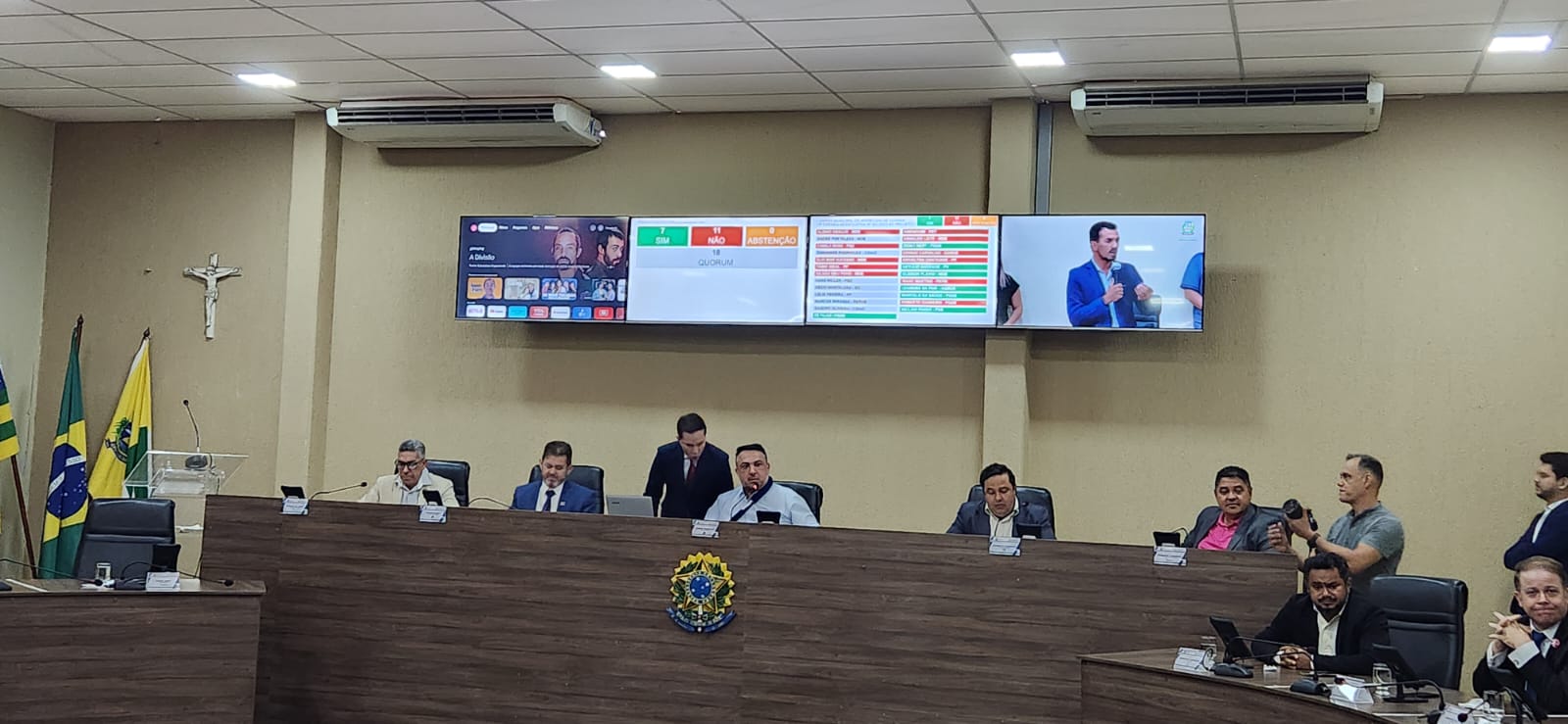 Uma das TVs do plenário da Câmara Municipal de Aparecida de Goiânia exibiu imagens de streaming de vídeos durante realização de Sessão Extraordinária, na manhã desta 4ª feira (1). Enquanto