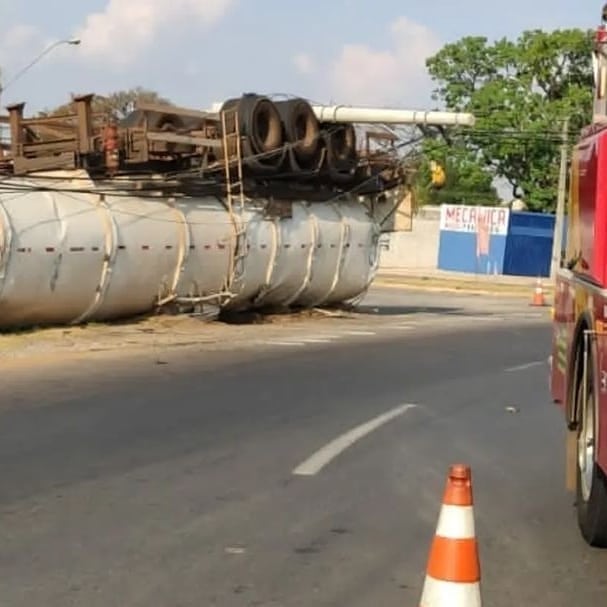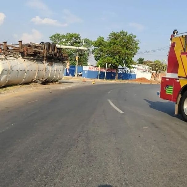 Na tarde desta 2ª feira (27), um caminhão de líquido inflamável capotou em Aparecida de Goiânia, ao tentar realizar uma curva acentuada no Anel Viário, que dá acesso à BR-060.