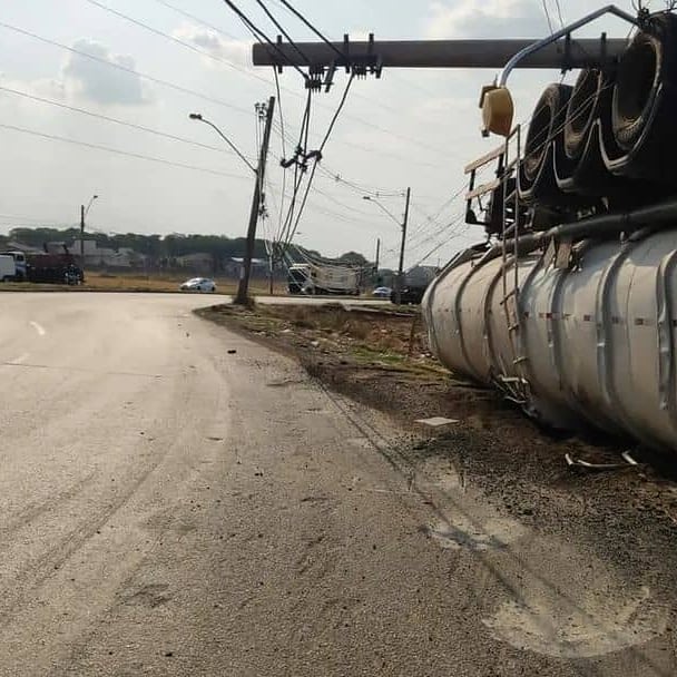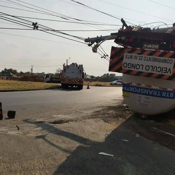 A carreta do bitrem desacoplou e capotou, atingindo um poste de energia.