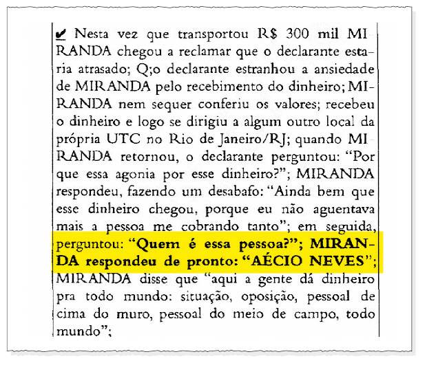 Rocha conta ainda que em uma das entregas em outubro de 2013, Miranda “estava bastante ansioso” pelos R$ 300 mil. Questionado sobre a razão da ansiedade, Miranda teria respondido que Aécio estava cobrando muito pelo dinheiro.
