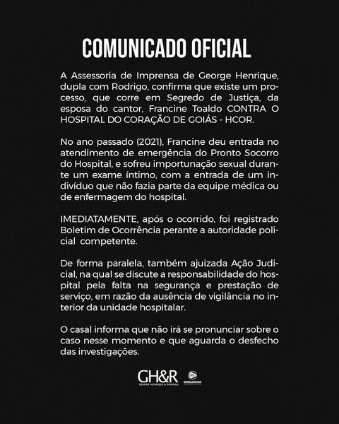 A esposa do cantor George Henrique, Francine Toaldo, relatou ter sofrido abuso sexual durante atendimento em um hospital de Goiânia.