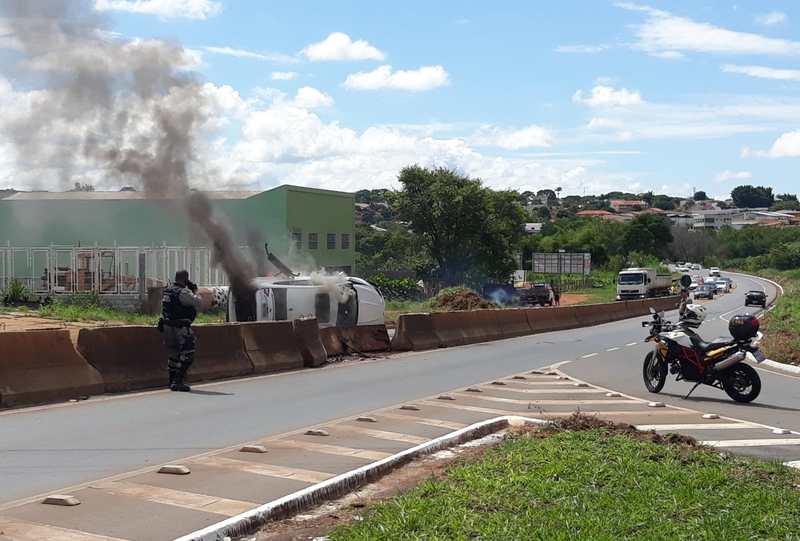 Foi então que o carro colidiu contra a mureta de proteção da via, capotou e pegou fogo.