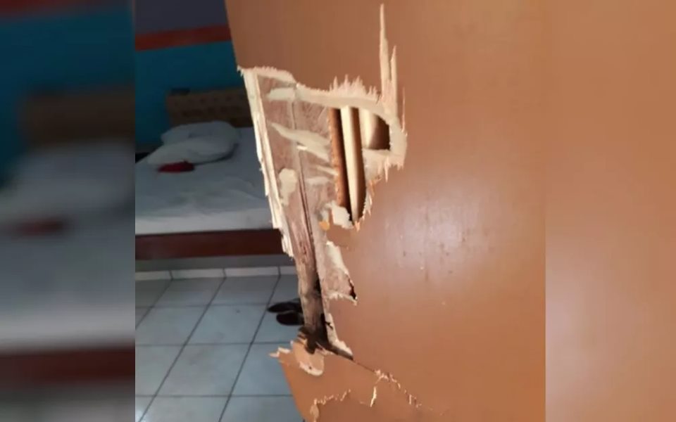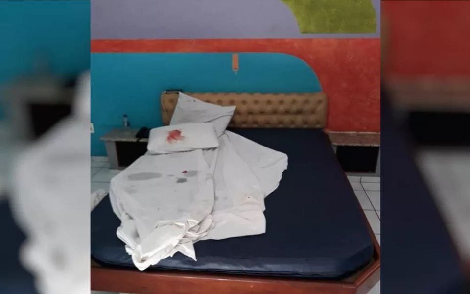 A vítima, localizada pela PM no chão da suíte usando apenas uma calcinha, foi socorrida pelo Corpo de Bombeiros.