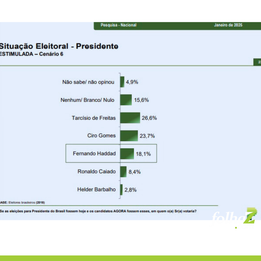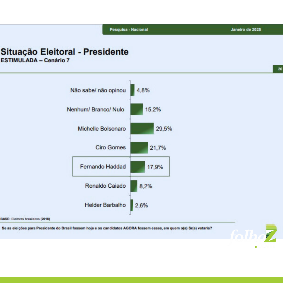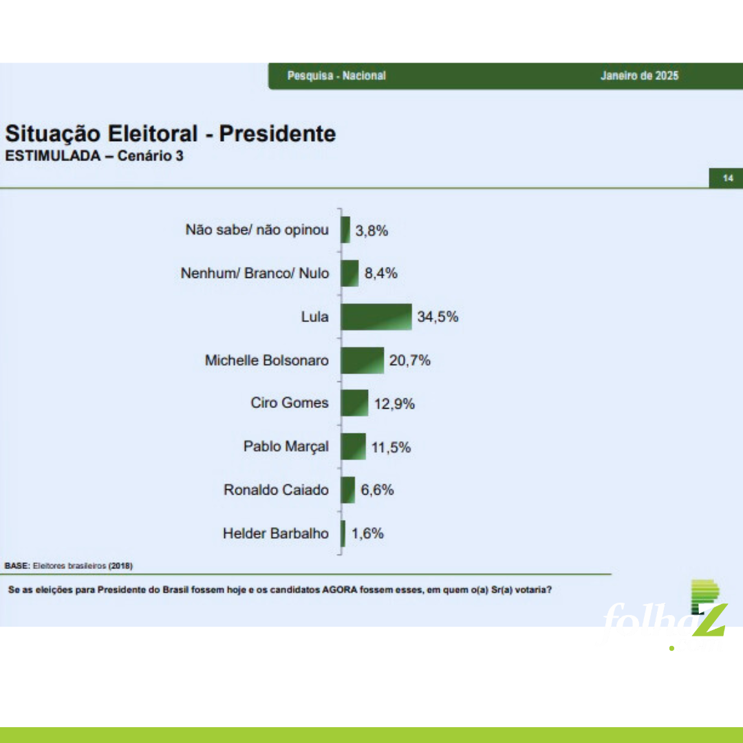 Outros possíveis candidatos mencionados incluem o governador de São Paulo, Tarcísio de Freitas (1,6%), Ciro Gomes (1,2%), Pablo Marçal (0,7%), Eduardo Bolsonaro (0,4%), Gusttavo Lima (0,4%), Michele Bolsonaro (0,4%) e outros (1,2%).