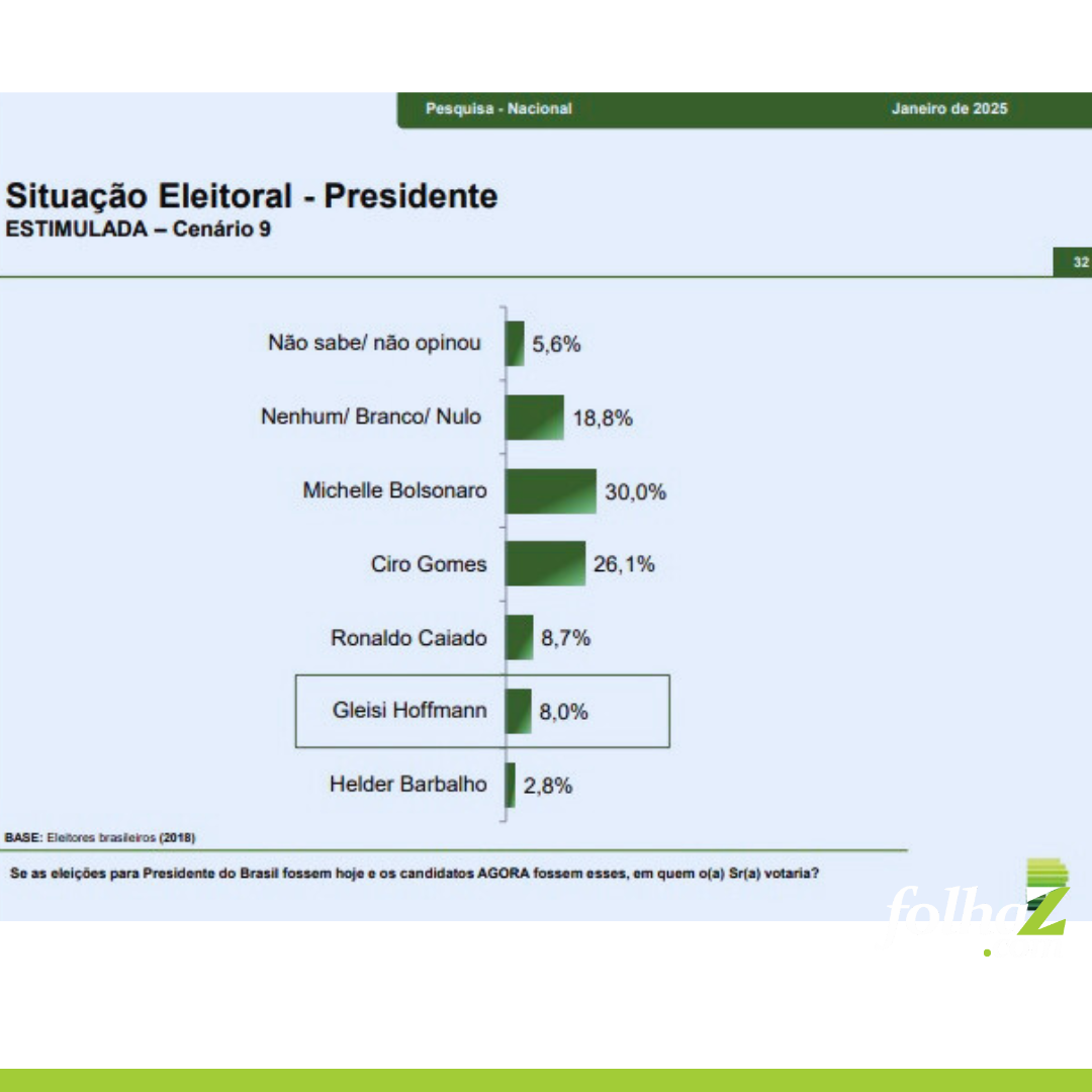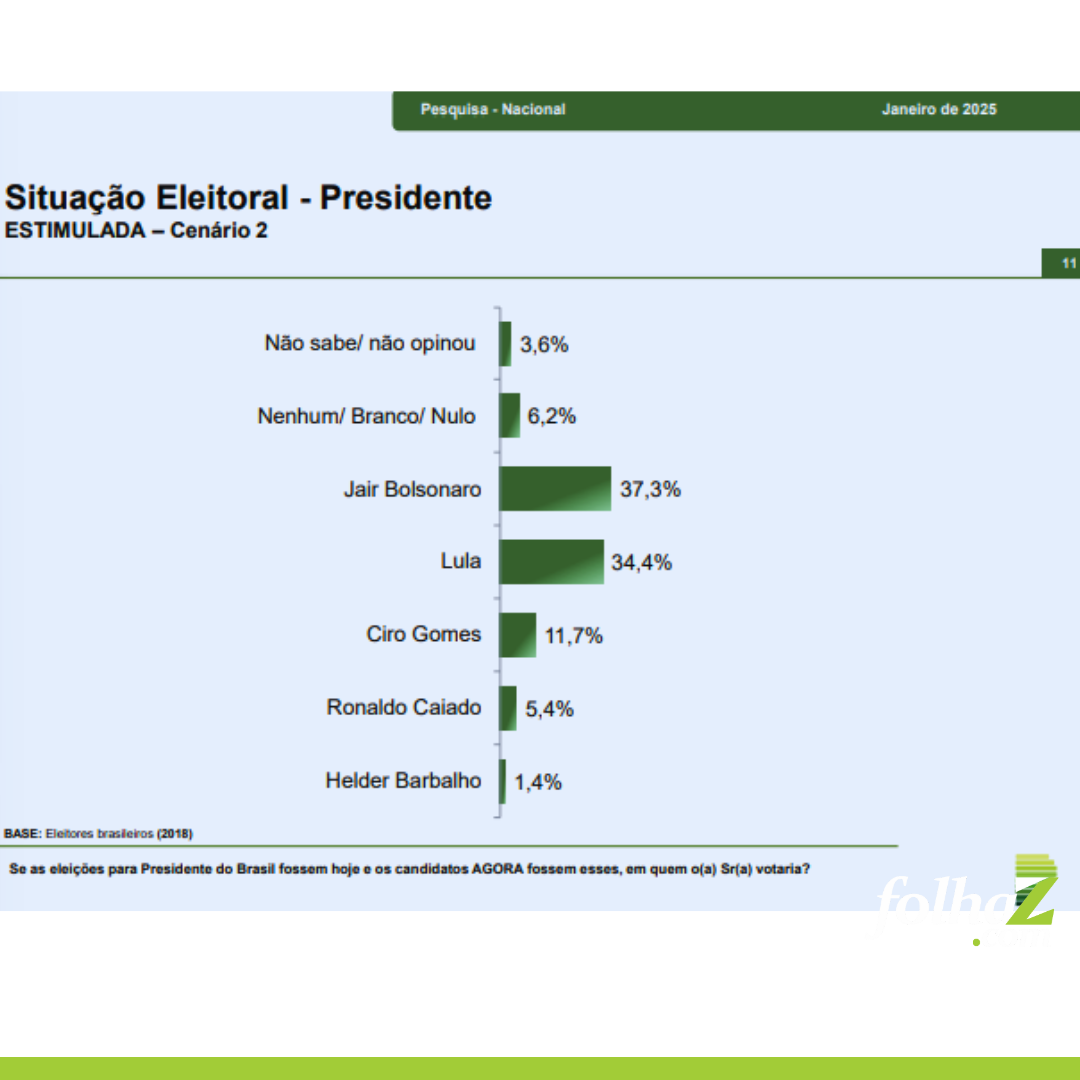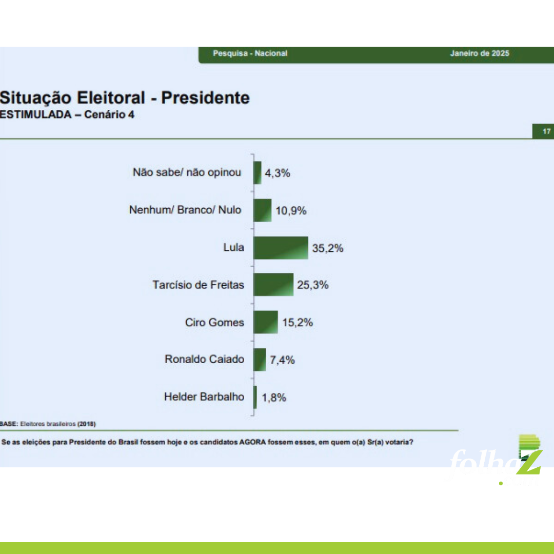 Outros possíveis candidatos mencionados incluem o governador de São Paulo, Tarcísio de Freitas (1,6%), Ciro Gomes (1,2%), Pablo Marçal (0,7%), Eduardo Bolsonaro (0,4%), Gusttavo Lima (0,4%), Michele Bolsonaro (0,4%) e outros (1,2%).