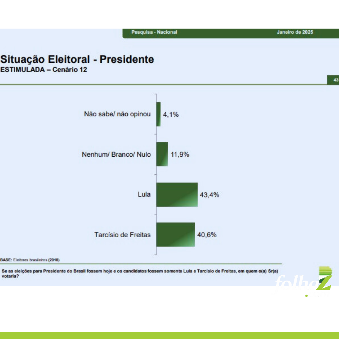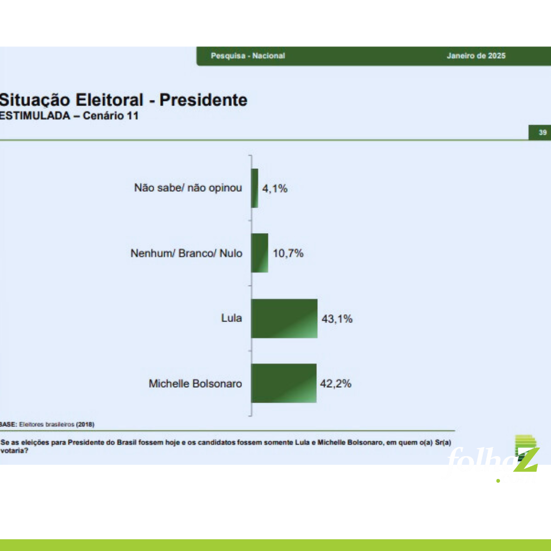Em um cenário contra Lula, Michele obteve 42,2%, enquanto o petista ficou com 43,1%. Já no confronto com Tarcísio, Lula registrou 43,4% contra 40,1% do governador paulista.