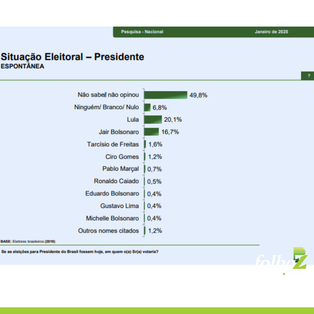 A pesquisa também revelou que 49,8% dos entrevistados ainda estão indecisos, enquanto 6,8% declararam intenção de votar nulo ou em branco.