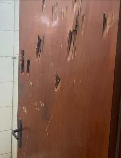 Vários disparos foram feitos contra a porta e pelo menos 4 atingiram o homem, que sobreviveu.