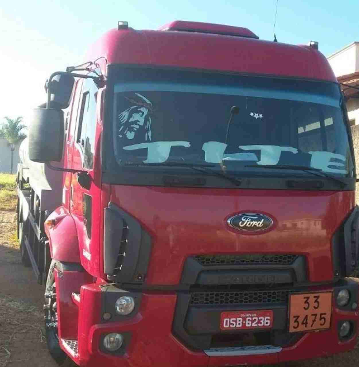 Caminhão roubado. No para-brisa está escrito o apelido do caminhoneiro: Tite