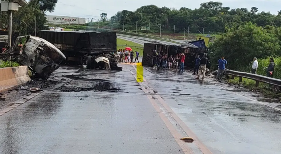 A colisão frontal entre 2 carretas aconteceu sobre a ponte que liga Itumbiara (GO) a Arapurã (MG).