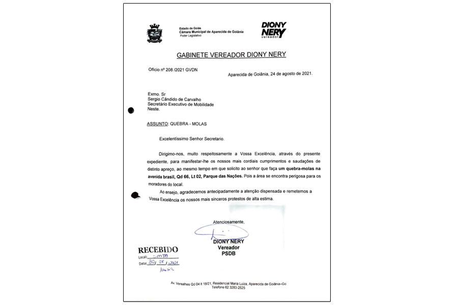 ofício enviado pelo vereador Diony Nery (PSDB) à Secretaria Executiva de Mobilidade | Foto: Reprodução