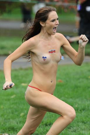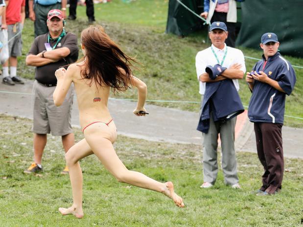 Uma mulher seminua utilizando apenas uma calcinha fio dental, sapatilhas pretas e adesivos pelo corpo surpreendeu torcedores e jogadores ao invadir no último domingo a disputa do Presidents Cup, tradicional torneio de golfe jogado nos Estados Unidos. A mulher entrou em cena durante o 18º buraco do quarto dia de competições do evento disputado em Muirfield Village Golf Club, na cidade de Dublin, no Estado de Ohio.