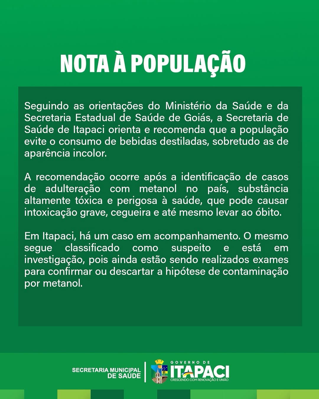 A Prefeitura de Itapaci reforçou a recomendação da Secretaria Estadual de Saúde (SES-GO) e do Ministério da Saúde para que a população evite o consumo de bebidas destiladas, especialmente as de aparência incolor.