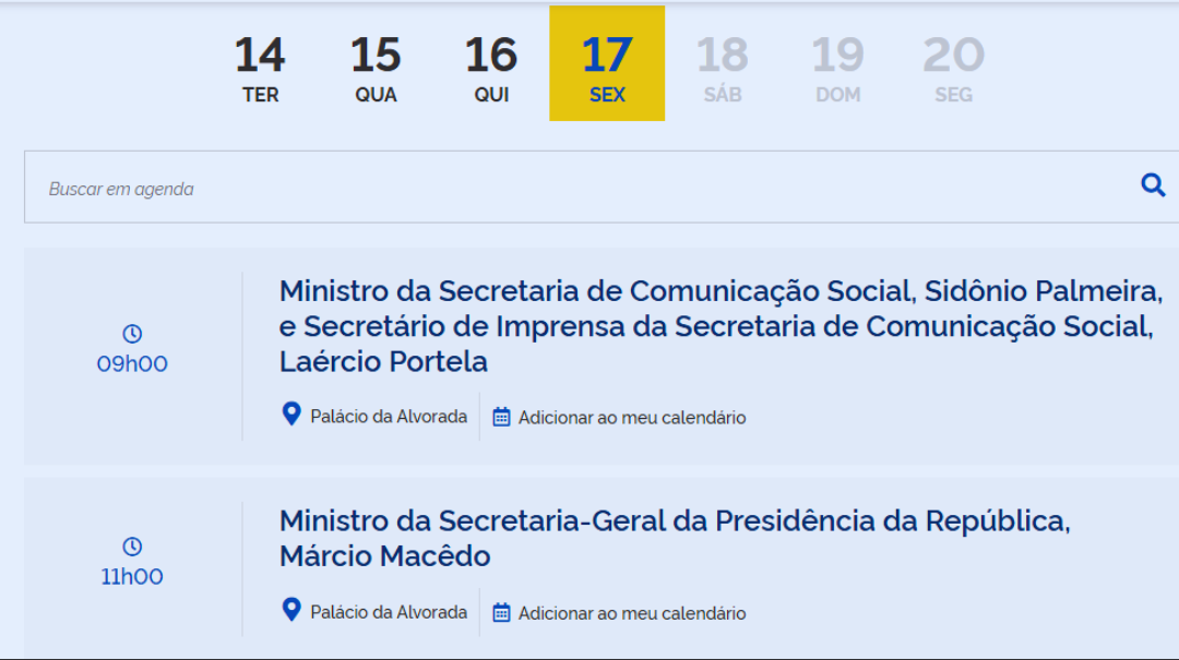 A agenda está disponível no Portal da Transparência do Governo Federal.