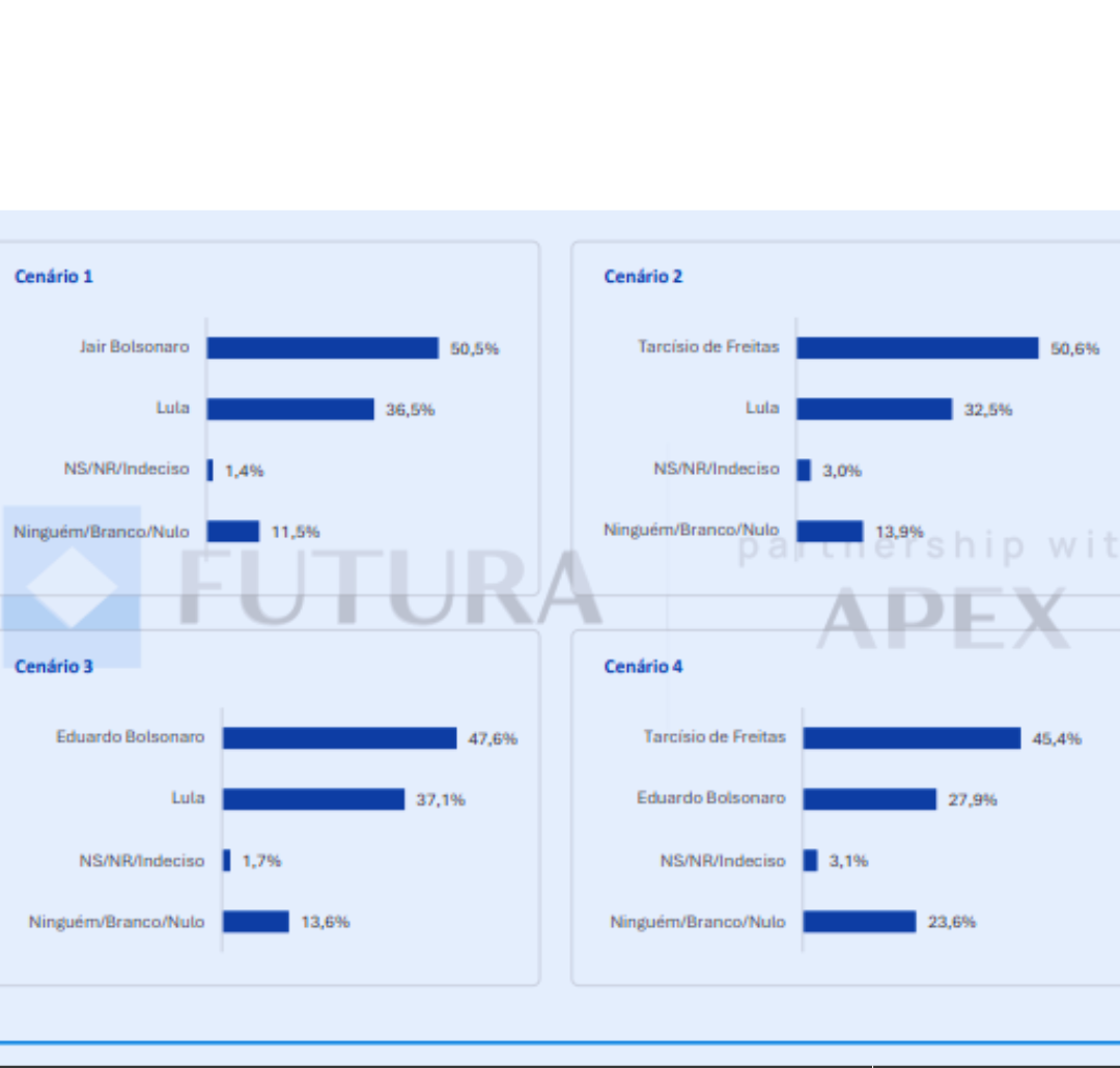 Outros candidatos testados: Ratinho Jr (13,4%), Tarcísio (11,1%) e Zema (10,1%).