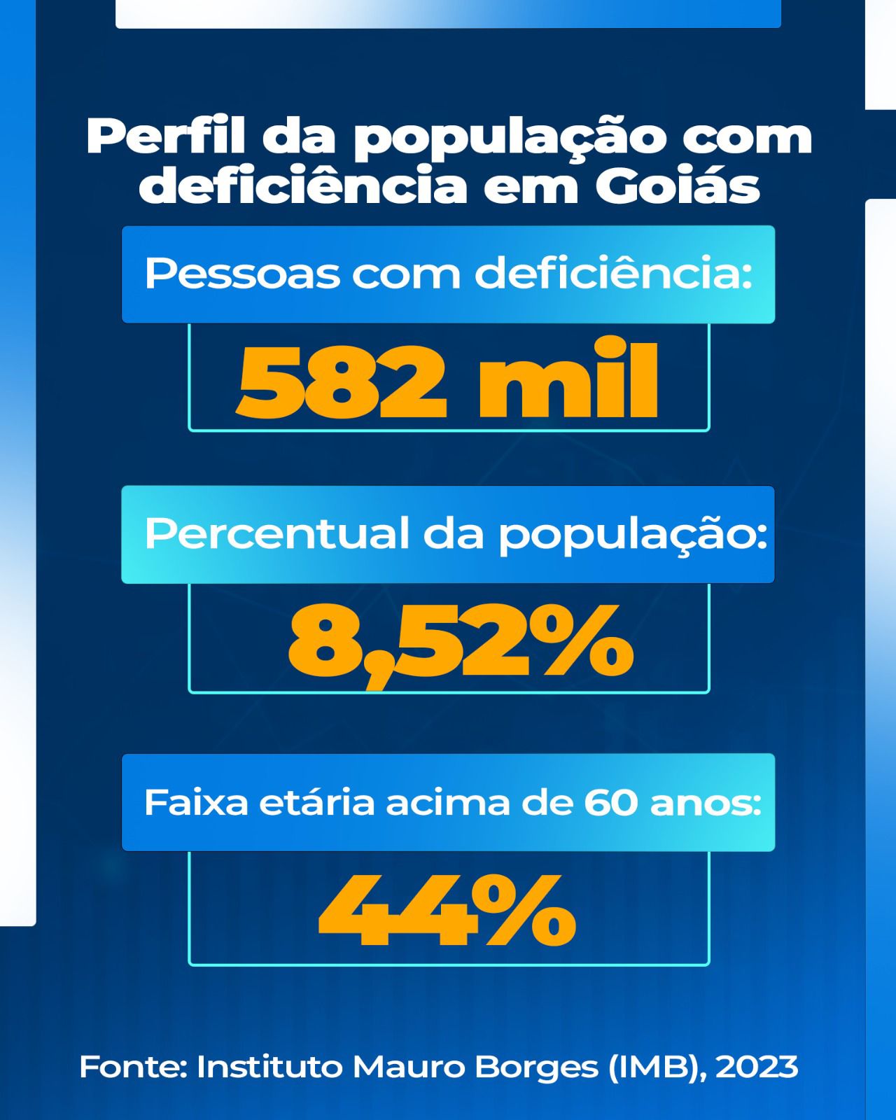 Segundo o Instituto Mauro Borges (IMB), cerca de 582 mil pessoas em Goiás possuem algum tipo de deficiência, equivalente a 8,52% da população do Estado.