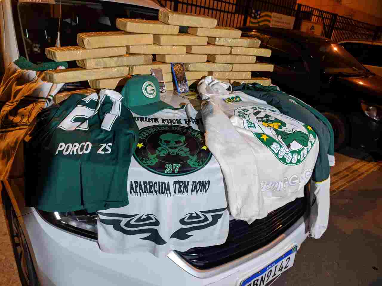 Na residência, a PM encontrou 22 kg de maconha escondidas em uma caixa de papelão, uma balança de precisão, vários materiais da torcida FJG e um celular que era utilizado para vender os entorpecentes.