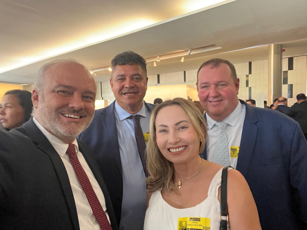 O presidente do Progressistas de Aparecida, Divino Ajax, e os vereadores Roberto Chaveiro (PP), Camila Rosa e Tatá Teixeira, ambos do União Brasil, marcaram presença em Brasília nesta 3ª feira (29) para participar da cerimônia de oficialização da federação entre os 2 partidos.