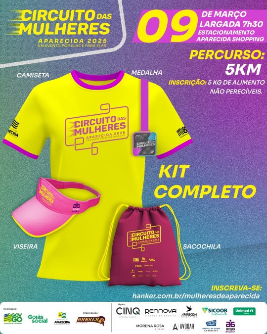 Além disso, a corrida é organizada pela Prefeitura de Aparecida de Goiânia, por meio da Secretaria Municipal de Políticas Públicas para as Mulheres, e conta com o apoio de diversos patrocinadores.