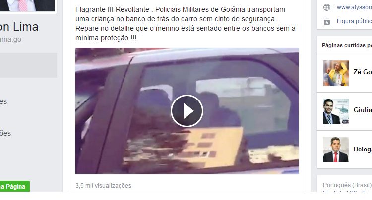 Na legenda, o vereador escreveu: “Flagrante! Revoltante. Policiais Militares de Goiânia transportam uma criança no banco de trás do carro sem cinto de segurança. Repare no detalhe que o menino está sentado entre os bancos sem a mínima proteção”.