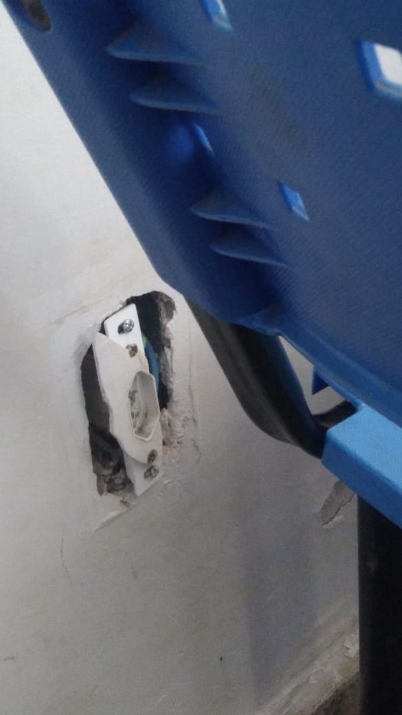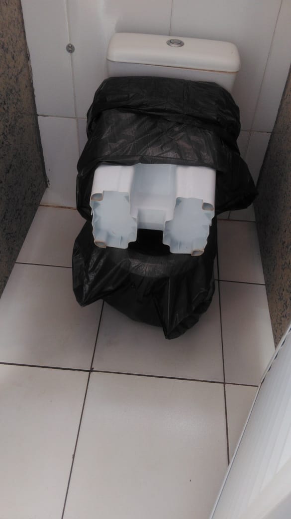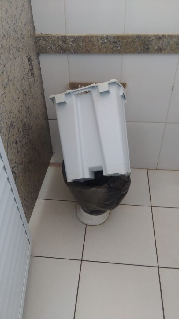 Nas fotos, é possível ver que alguns vasos sanitários estão com defeito, as paredes estão esburacadas e desbotadas, tomadas elétricas expostas, e até o bebedouro desperdiçando água.