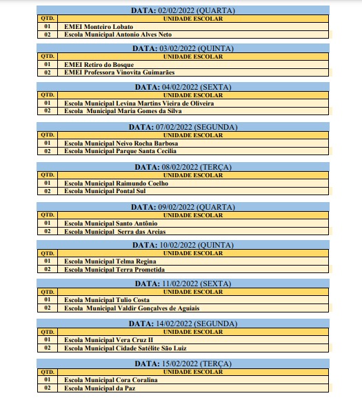 No local, a vacinação ocorrerá em dois dias, na 5ª e na 6ª feira (21), nos 2 turnos: das 8h30 às 11h e das 13h30 às 17h.